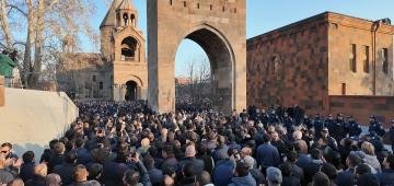 Հավատացյալները Մայր Աթոռից հեռացել են միայն Կաթողիկոսի վեհարան վերադառնալուց հետոՄիկրոավտոբուսով, ոստիակնների ու քաղաքացիական հագուստով անձանց հսկողությամբ Մայր աթոռ ժամանած եպիսկոպոսների խումբը Տրդատ թագավորի կամարի մոտ փորձել է հայտարարություն ընթերցել, սակայն հավատացյալների վանկարկումների արդյունքում նրանց ձայնը չի լսվել։ Սկզբում եպիսկոպոսների խմբի անունից փորձել է հայտարարություն տարածել Անուշավան եպիսկոպոս Ժամկոչյանը, ապա Վազգեն արքեպիսկոպոս Միրզախանյանը։ Նրանք Մայր աթոռի տարածքից հեռացել են հավատացյալների սուլոցների և ուժայինների ուղեկցությամբ։ Ամենայն հայոց Կաթողիկոսին աջակցելու եկած քաղաքացիները սպասել են մինչեւ նորին սրբությունը տաճարից վերադառնա վեհարան, որից հետո հեռացել են։ |
