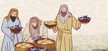 Հացի բազմացումըԱվելի քան 5000 մարդ օրերով լսում են Հիսուսին։ Առաքյալները հայտնում են, որ ընդամենը 5 հաց եւ 2 ձուկ կա։ Հիսուսը օրհնում է և պատվիրում բաժանել մարդկանց։ |