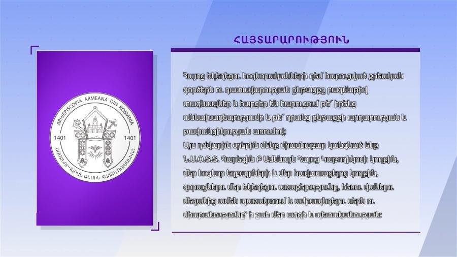 Ռումինիայի Հայոց թեմը կոչ է անում Հայաստանի իշխանություններին՝ առաջնորդվելու արդարության, թափանցիկության և օրինականության սկզբունքներով և հանձնառությամբ՝ հանդեպ հավատքի ու հայրենասիրության այն անխախտ արժեքները, որոնք դարեր շարունակ ամրացրել ու պահպանել են մեր Ժողովրդին: Թեմը հայտարարել է, որ այս օրերին միասնաբար կանգնած են Ն.Ս.Օ.Տ.Տ. Գարեգին Բ Ամենայն Հայոց Կաթողիկոսի, հոգևոր եղբայրների և հավատացյալների կողքին։
