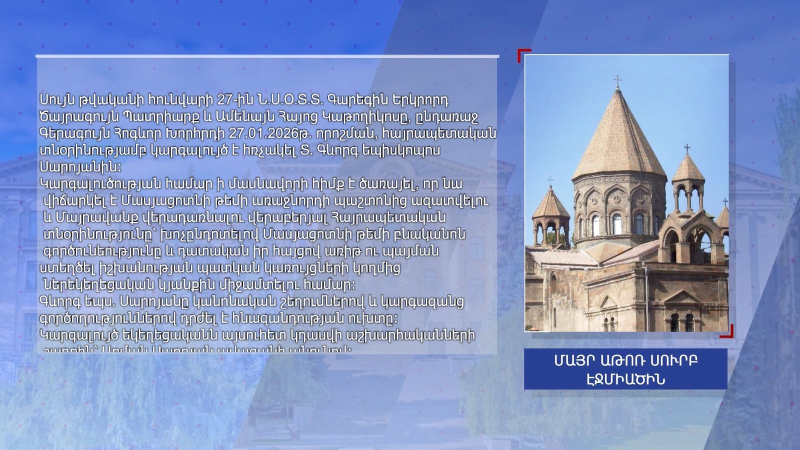 Գերագույն Հոգեւոր Խորհրդի անդամ Գեւորգ Դանիելյանը մտավախություն ունի, որ քննչական կոմիտեի նախաձեռնած վարույթը եկեղեցու դեմ՝ դատական ակտը չկատարելու համար, կարող է հարվածի տակ դրվել փետրվարին Ավստրիայում գումարվելիք եպիսկոպոսաց ժողովը։ Գևորգ սրբազանը կարգալույծ հռչակվեց հունվարի 27-ին, իսկ հունվարի 29-ին հայտնի դարձավ, որ քննչական կոմիտեն վարույթ է նախաձեռնել եկեղեցու դեմ։ Նա անհիմն է համարում պնդումը, թե Գերագույն Հոգեւոր Խորհուրդը ընդունել է տնօրինություն հատուկ իբրև թե դատական ակտը խոչընդոտելու նպատակով։ Նա պնդում է՝ եկեղեցին իրավասու է կայացնելու որոշումներ և եթե դրա համար կան բավարար հիմքեր, հակառակը՝ չկայացնելը կարող է խնդրահարույց լինել։
