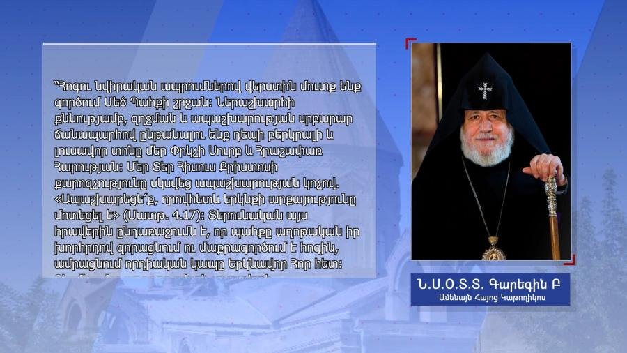 Վեհափառ Հայրապետը մաղթել է հայրենական կյանքի խնդիրների ու եկեղեցու դեմ տարատեսակ հարձակումներով մտահոգ հոգիները խաղաղություն գտնեն Տեր Հիսուս Քրիստոսով։ «Մեր օրերում, երբ ազգային ու հայրենական կյանքի խնդիրների, մեր Սուրբ Եկեղեցու դեմ տարատեսակ հարձակումների մտահոգություններով ալեկոծ են մեր հոգիները, խաղաղություն գտնենք մեր Տեր Հիսուս Քրիստոսով, Ում միջոցով հաշտվեցինք Աստծո հետ։ Ապրենք ազգի ու հայրենիքի նկատմամբ ամենայն նվիրումով, մեր ինքնությանն ու սրբազան արժեքների հանդեպ անբեկանելի նախանձախնդրությամբ, մեր Մայր Եկեղեցուն հավատարիմ մնալու հաստատակամությամբ»։