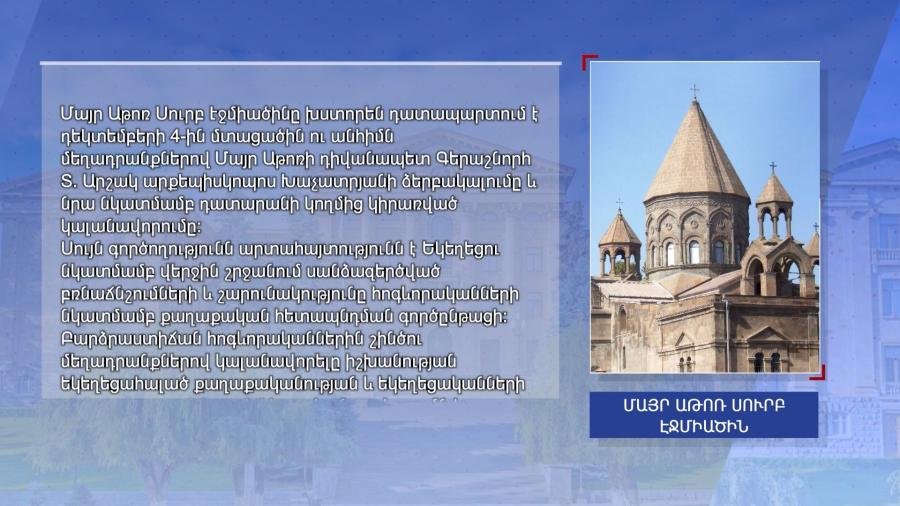 The Mother See has issued a statement demanding an immediate end to the illegal persecution of Archbishop Arshak Khachatryan and the remaining imprisoned clergy and the restoration of their violated rights. Holy Etchmiadzin considers the detention of high-ranking clergy on fabricated charges to be another manifestation of the authorities’ anti-church policy and hate speech against clergy.